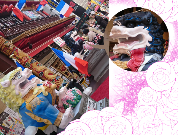 たくさんのフランス国旗と、OAを象った狛犬がお出迎え!!