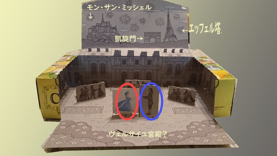 箱で工作すると、ベルサイユの庭園と思われる場所に貴族の紳士淑女が立ち現れます。