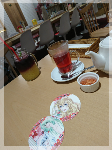 ”アントワネットのローズヒップティー、バラのジャム添え”と、”オスカルとアンドレのワインクーラー”。