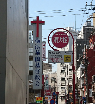 ”横浜華僑基督教会”の文字の向こうに、小さく看板が見えています。