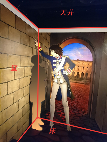 もちろん、手は壁に描きこんであるんですけれど、カメラのレンズを通して見ると、遠近法や影の影響で立体的に見えてしまうんですね。